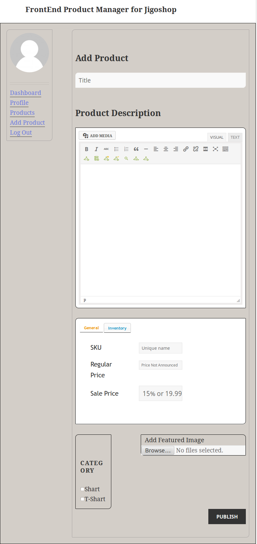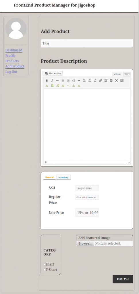 Jigoshop frontend product manager is a Jigoshop add-on that helps to manage all the user’s products and other Product settings from the front-end of your site. It reduces backend access required for the user to set up his own products on your site.